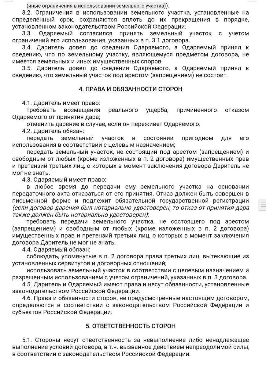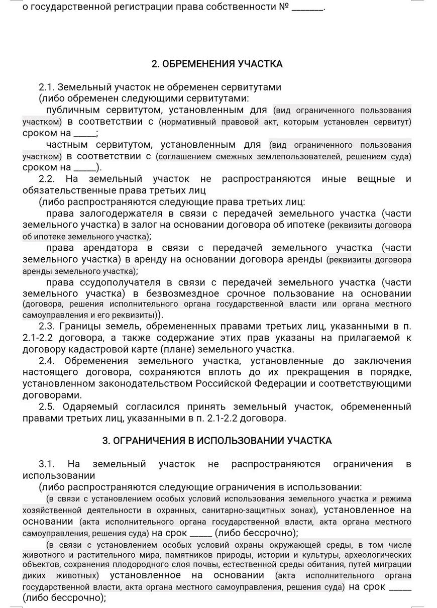 - Обременен ли участок сервитутами, правами залогодержателей, арен даторов, ссудополучателей; указание на согласие одаряемого принять обремененную землю.