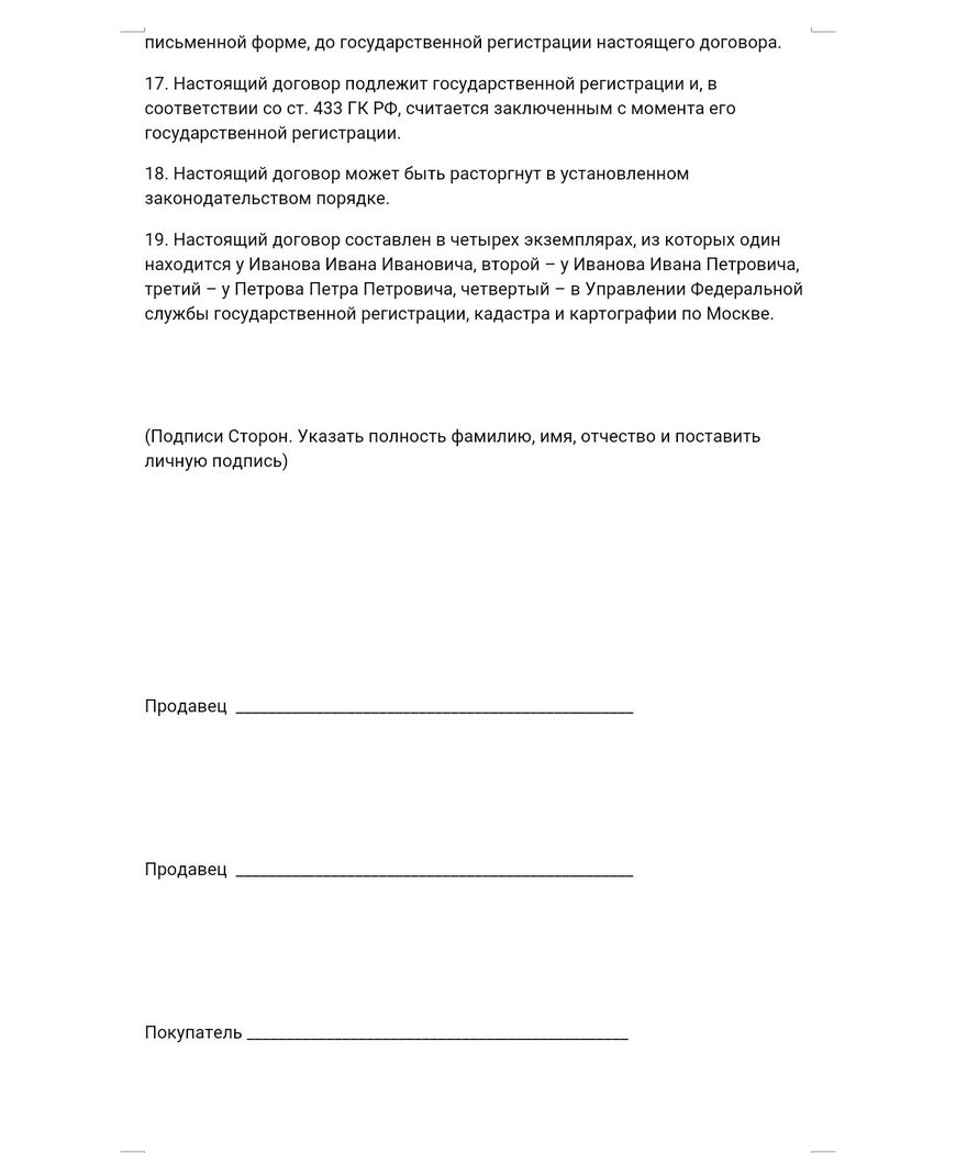 Для совершения сделки купли-продажи крайне важно подписать правильно составленный договор. С тем, как он должен выглядеть, можно ознакомиться ниже.