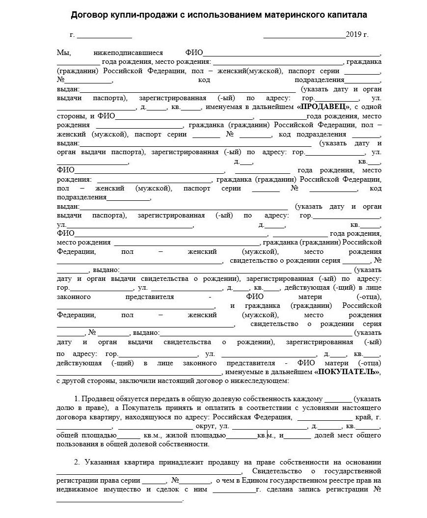 Договор купли-продажи доли квартиры с использованием материнского капитала