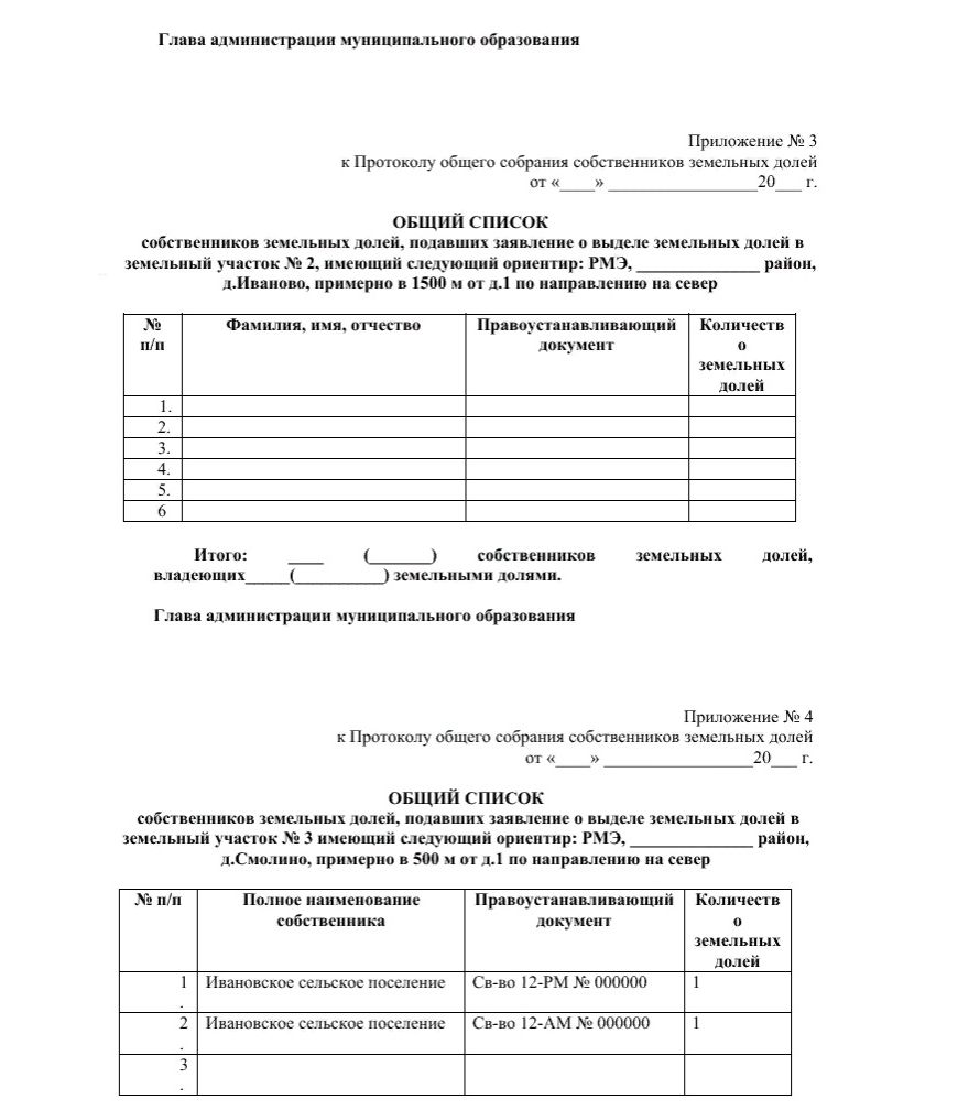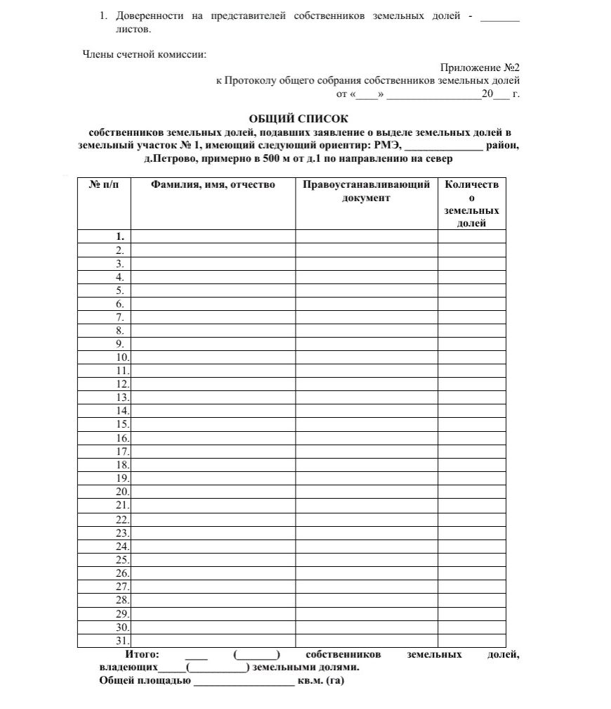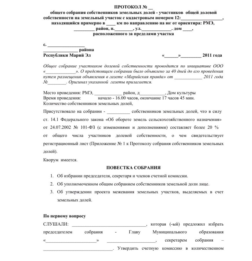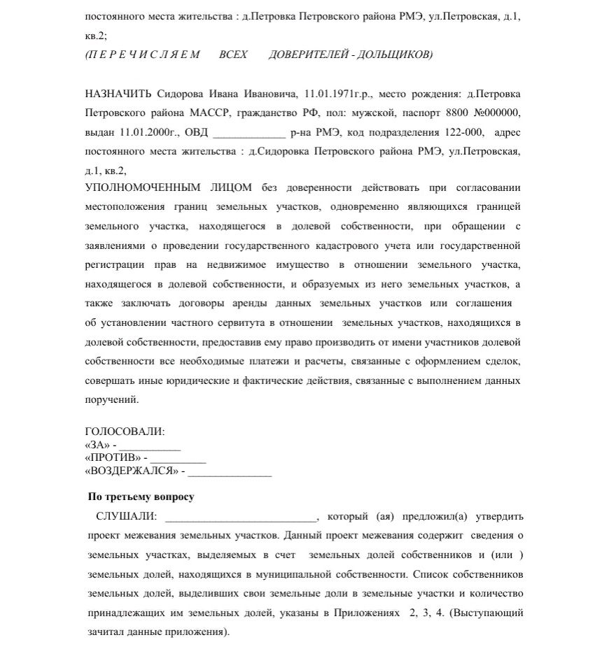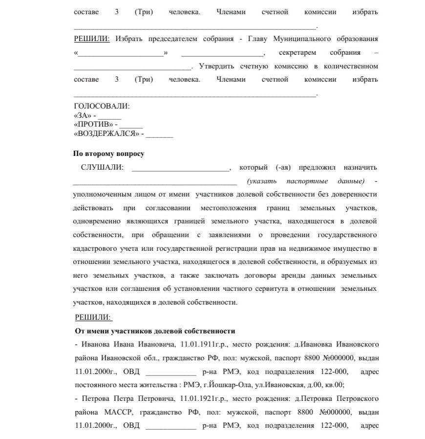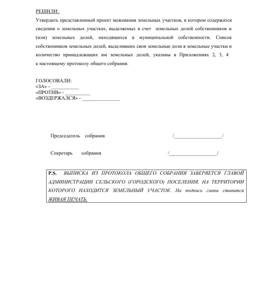 - согласие других долевых собственников на продажу земли 3-ему лицу (имеет форму письменных отказов совладельцев или форму протокола общего собрания дольщиков);
