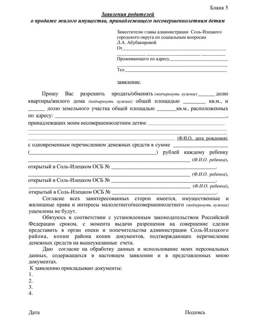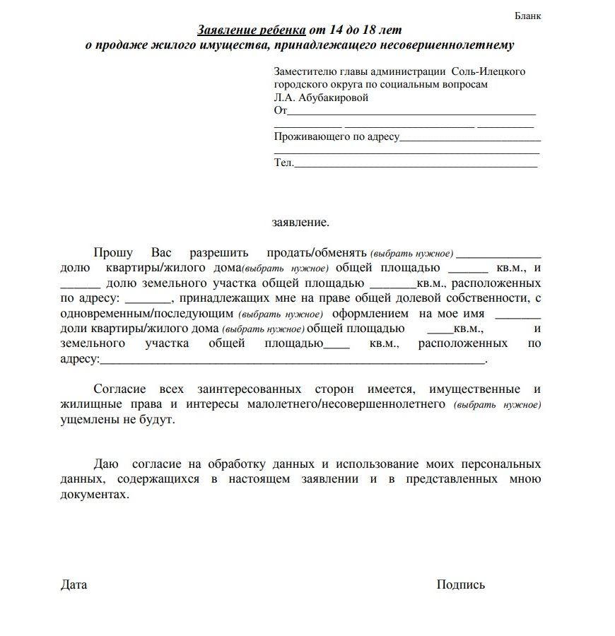 Если же инициатором продажи выступает сам ребенок в возрасте от 14 до 18 лет, то в своем заявлении ему понадобится попросить у сотрудников ООП разрешения на совершение сделки, а его законному представителю – написать свое согласие на отчуждение доли.