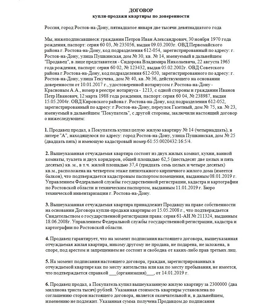 Договор купли-продажи квартиры по доверенности почти ничем не отличается от типового договора купли-продажи квартиры. Разница заключается в том, что в 1-ом случае в текст договора включается персональная информация: