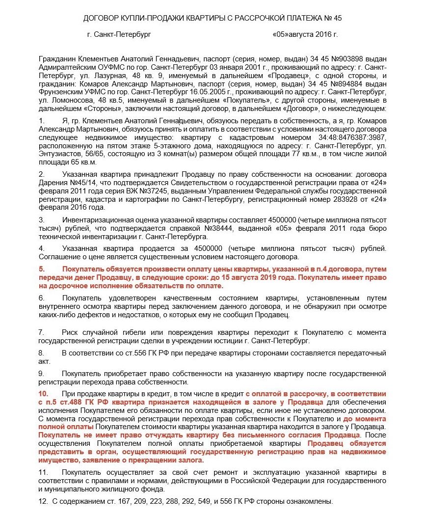 Например, если покупатель исправно осуществляет платежи по графику в течение полугода и внес половину или более обозначенной в договоре суммы, а затем исчез с поля зрения, продавец не сможет вернуть статус владельца квартиры. Однако если вписать в соглашение, что «…при нарушении графика выплат покупатель обязуется вернуть квартиру в собственность продавцу, даже если нам момент нарушений условий договора было выплачено более половины стоимости квартиры», продавец сможет требовать квартиру обратно.