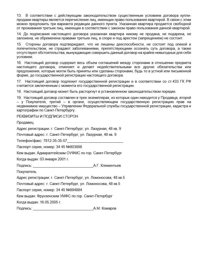 - Перечисление лиц, имеющих право пользоваться квартирой. Для продавца представляет интерес заключать соглашение с рассрочкой, если граждане, проживающие в квартире, какой-то период остаются в ней (например, родственники, арендаторы). Покупателю необходимо оговорить конечный срок снятия всех жильцов с регистрационного учета.