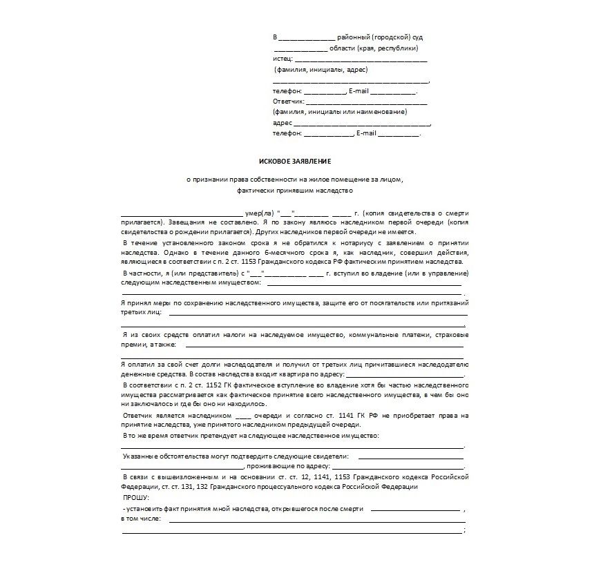 Образец искового заявления в суд о признании права на наследство