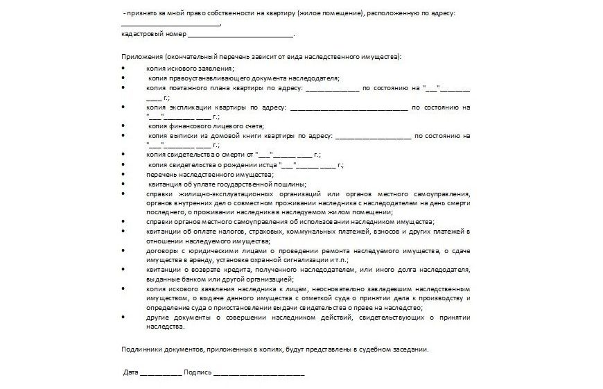 - Приложения. В качестве приложений к иску прикладываются документы: подтверждающие личность истца; доказывающие факт смерти наследодателя (свидетельство о смерти); содержащие данные о последнем месте проживания умершего (справка из ЖЭКа, выписка из домовой книги); содержащие информацию о родственных связях с умершим и указывающие на права наследования: свидетельство о рождении, свидетельство о браке; подтверждающие права собственности умершего на имущество; квитанция об оплате госпошлины.
