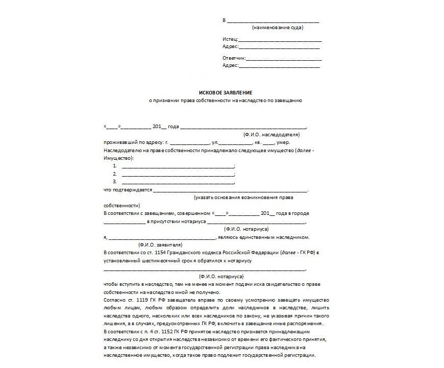 Исковое заявление о признании права собственности по завещанию (образец)