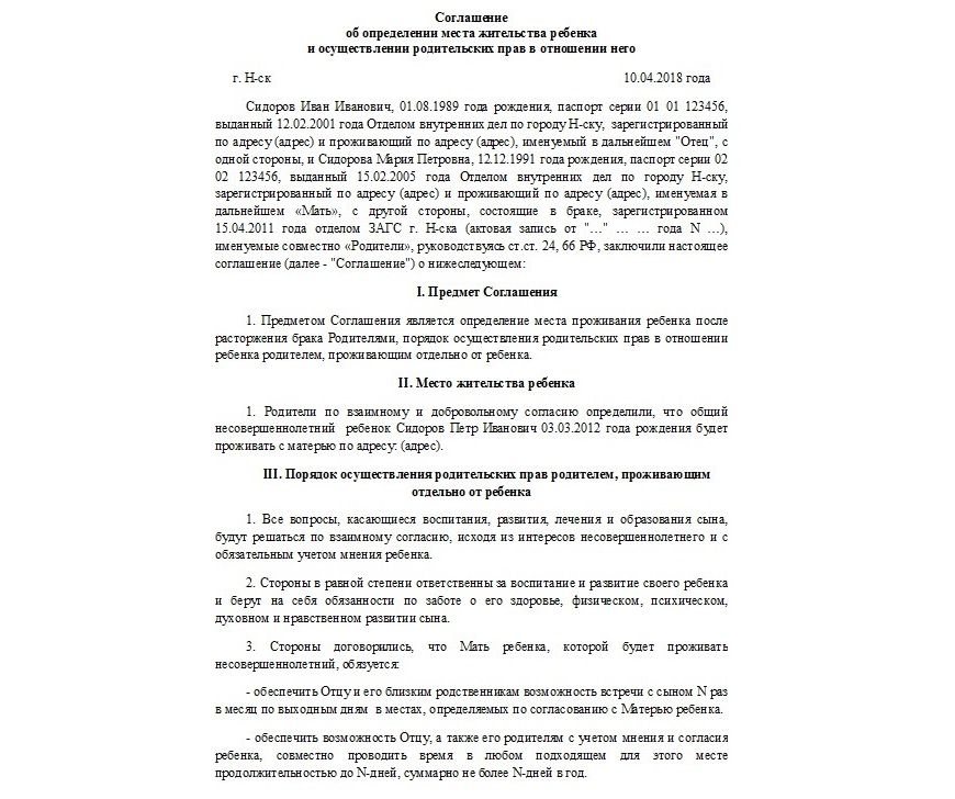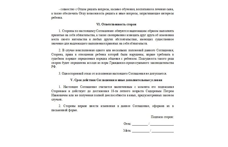 - Далее следуют разделы соответственно предмету соглашения: место проживания, порядок осуществления родительских прав и обязанностей.