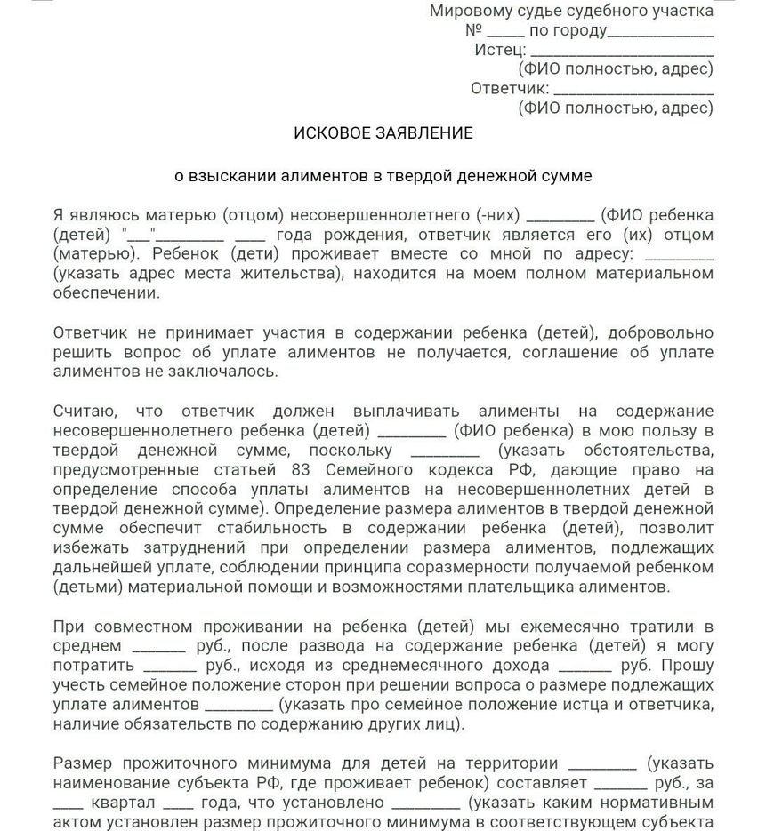 Иск о взыскании алиментов в твердой денежной сумме составляется с учетом требований ст. 131 ГПК РФ. Заявитель в нем, согласно правилам искового судопроизводства, именуется истцом, а алиментщик — ответчиком.