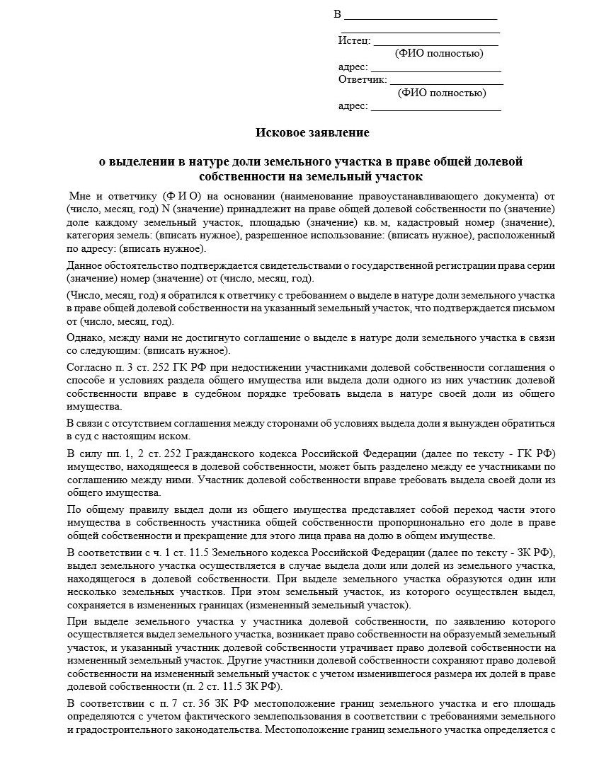 - Название документа — «Исковое заявление о выделе доли земельного участка».
