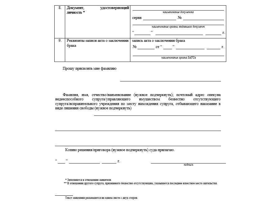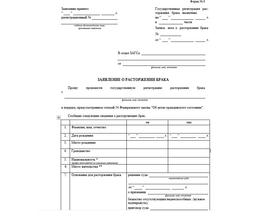 В ЗАГС подается заявление: форма №8 или №9, а для получения свидетельства после суда — форма № 10.