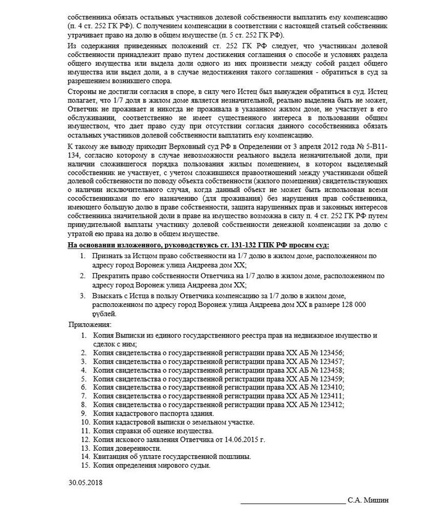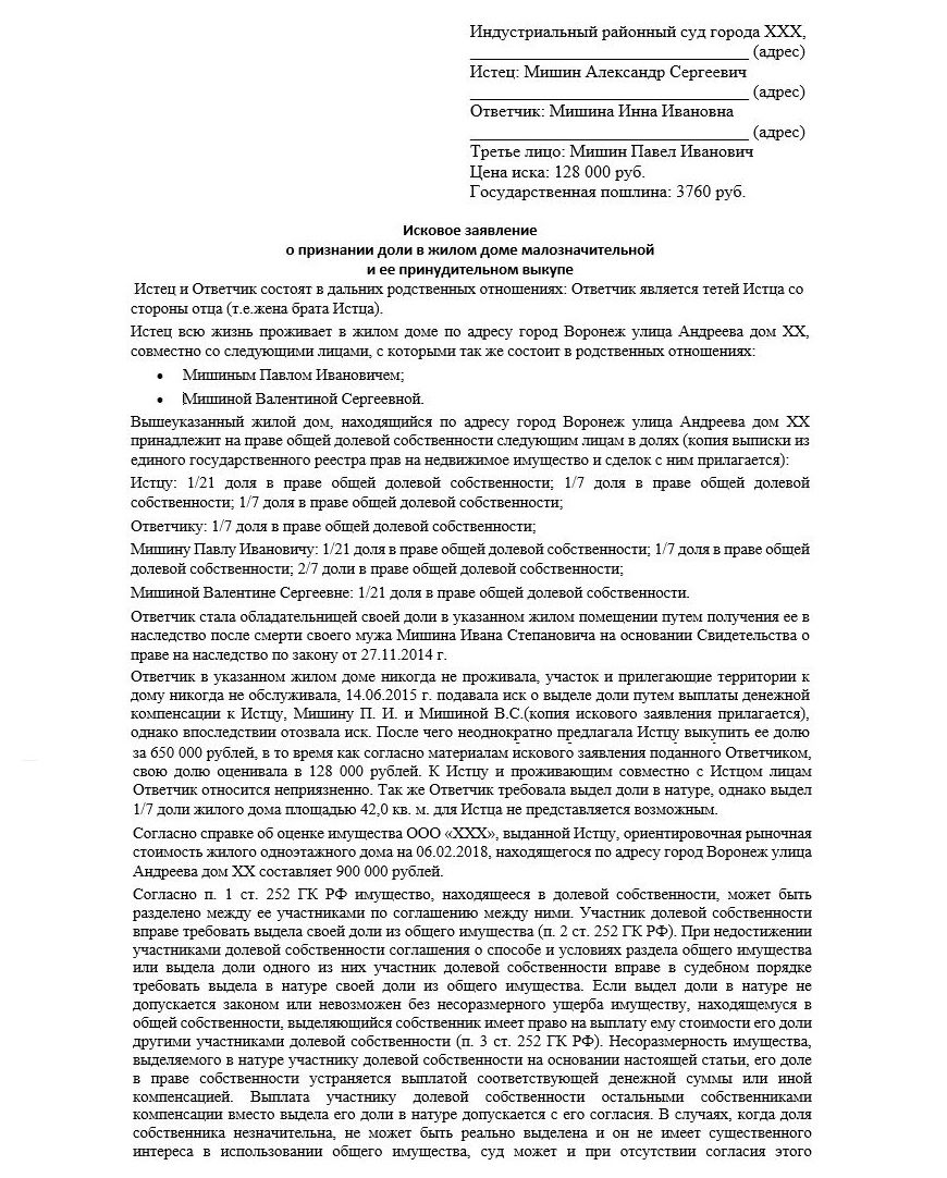 - Суть иска, где описываются основные обстоятельства дела: являются ли дольщики родственниками; кому и какая часть дома принадлежит, по какому праву; по какой причине возник конфликт. Истец должен внести предложение о выплате средств в счет компенсации, поскольку доля является незначительной.