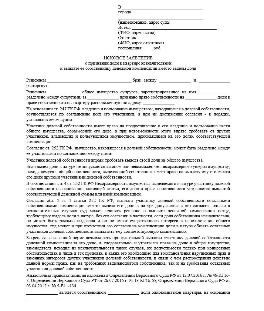 - название документа: «Иск о признании доли в квартире незначительной и выплате ее собственнику компенсации вместо выдела в натуре»;