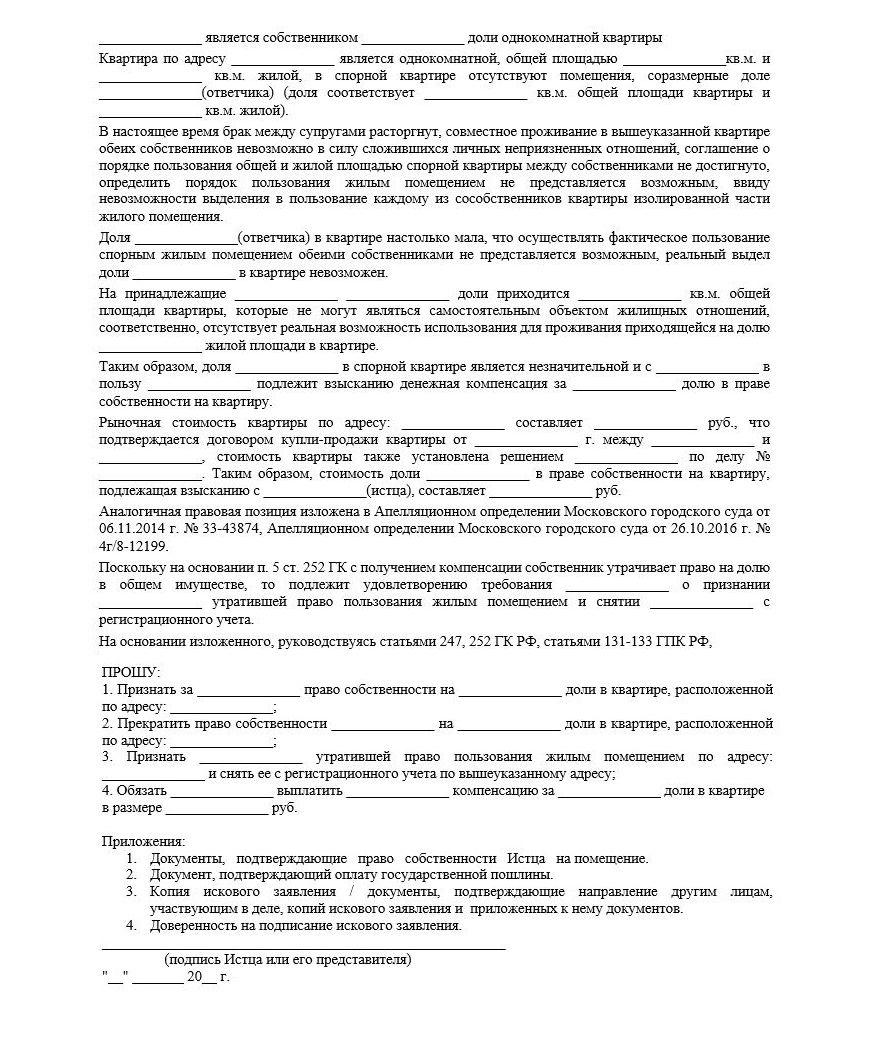- Наименование иска: «О признании доли незначительной и выплате денежной компенсации ее собственнику вместо выдела доли».