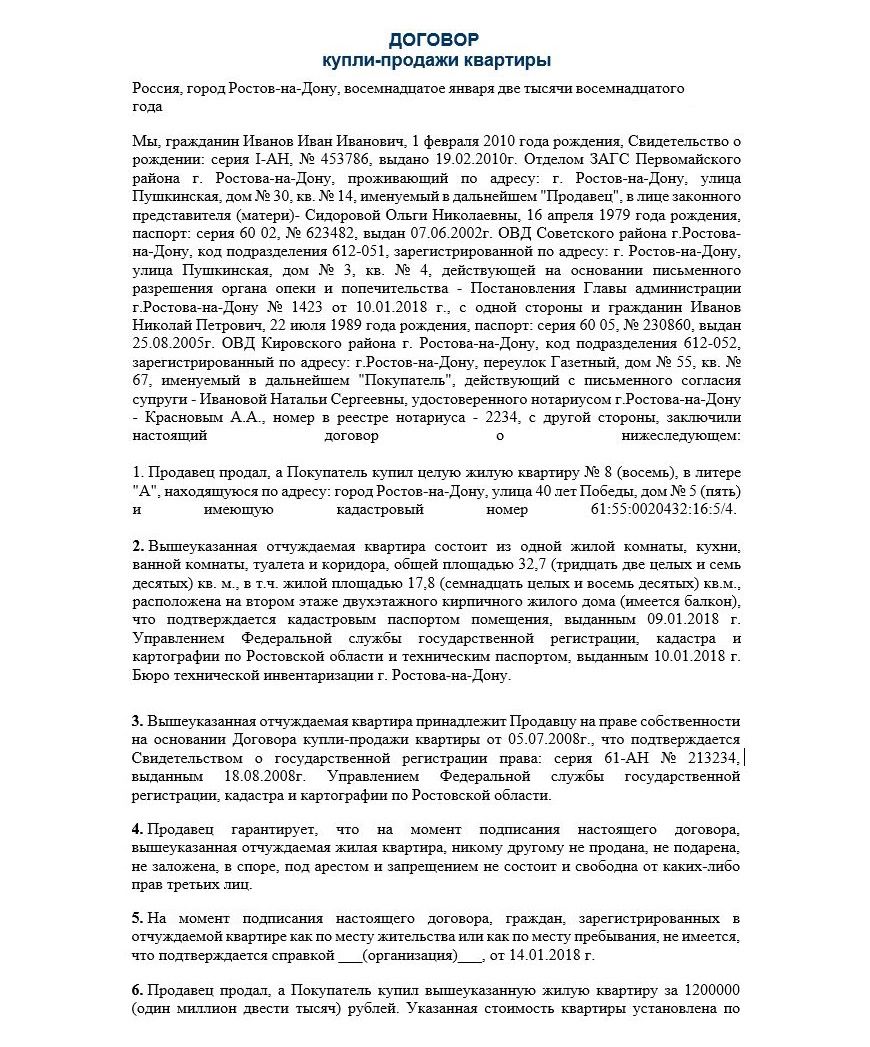 Договор купли-продажи квартиры с долями несовершеннолетних детей (образец)