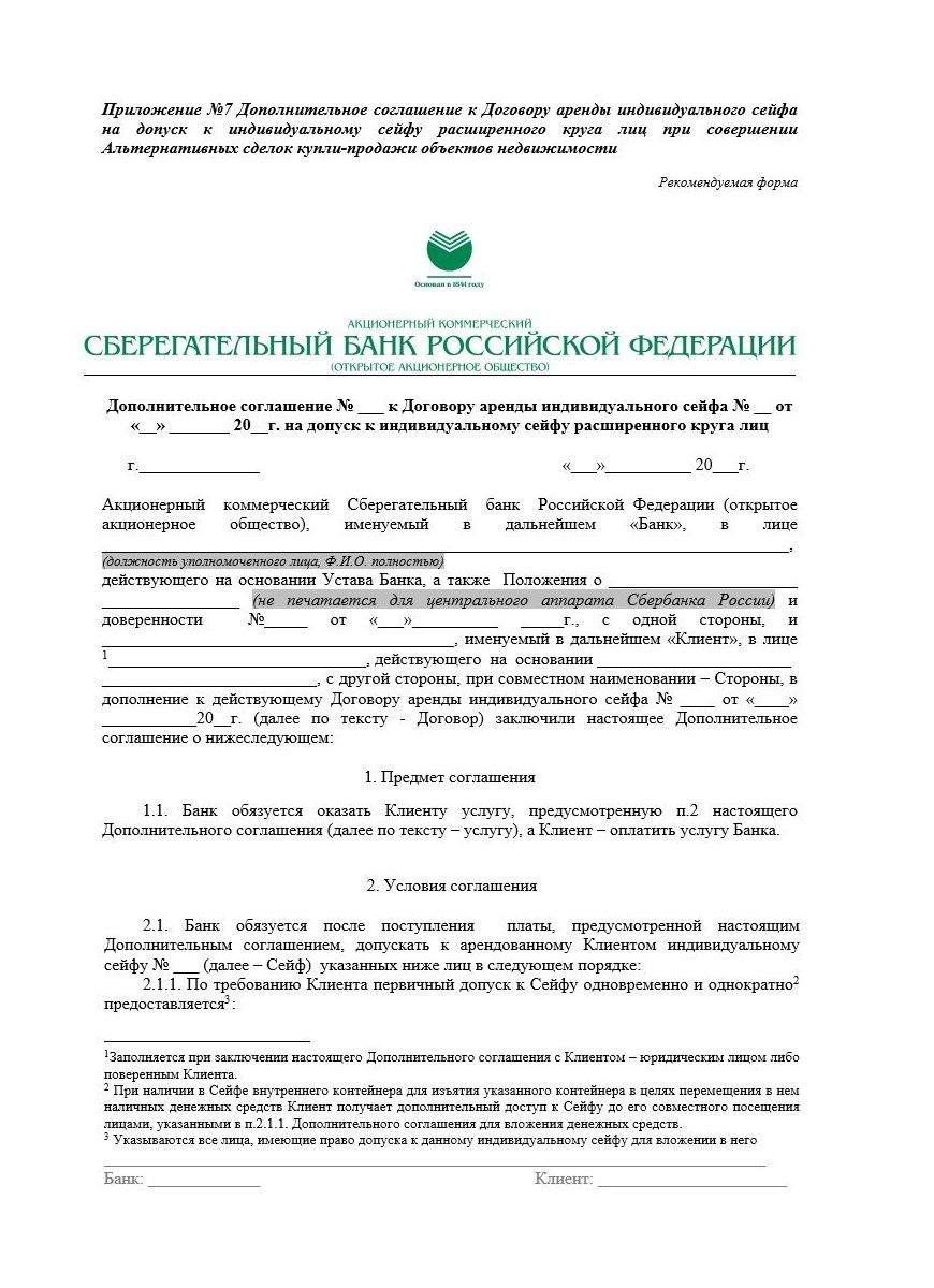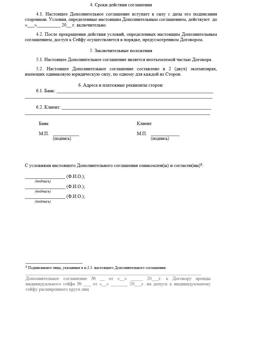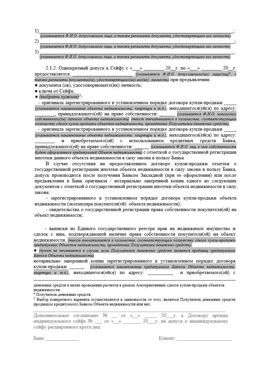 Помимо договора, заполняется допсоглашение. В нем описаны правила доступа второй стороны к ячейке, отражена возможность совместного доступа к сейфу (например, при форс-мажорных обстоятельствах).