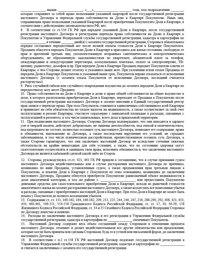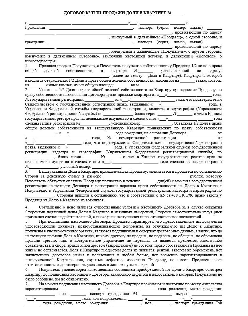 Распространенный способ приобретения доли квартиры мужа — заключение договора купли-продажи. При несогласии супруга существует один выход — убедить его в выгодности сделки. Обязать к продаже через суд можно только собственника незначительной доли, незаинтересованного в проживании в объекте.