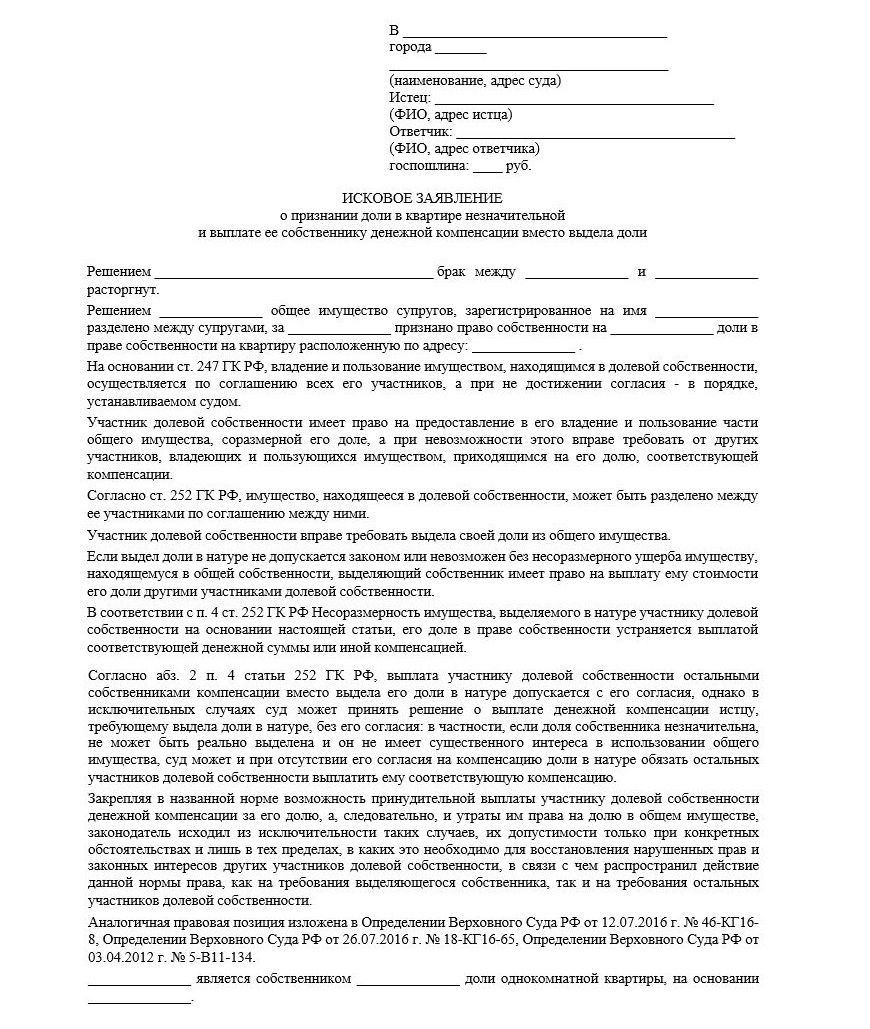 - Через суд. Жена-совладелица вправе потребовать выплату компенсации супругу в счет незначительной доли.