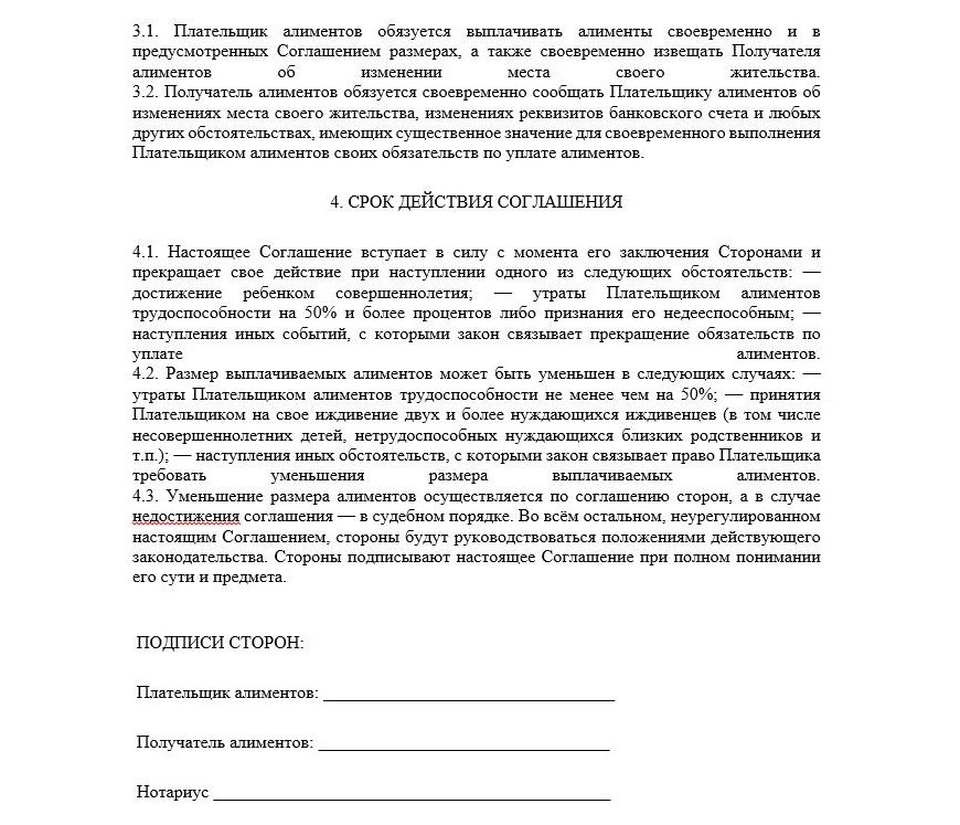 - Срок действия. Если договор касается детей до 18 лет, то его срок ограничен достижением ребенком совершеннолетия, однако если ребенок — инвалид или вопрос касается нетрудоспособных родителей, то срок произведения выплат может быть пожизненным.