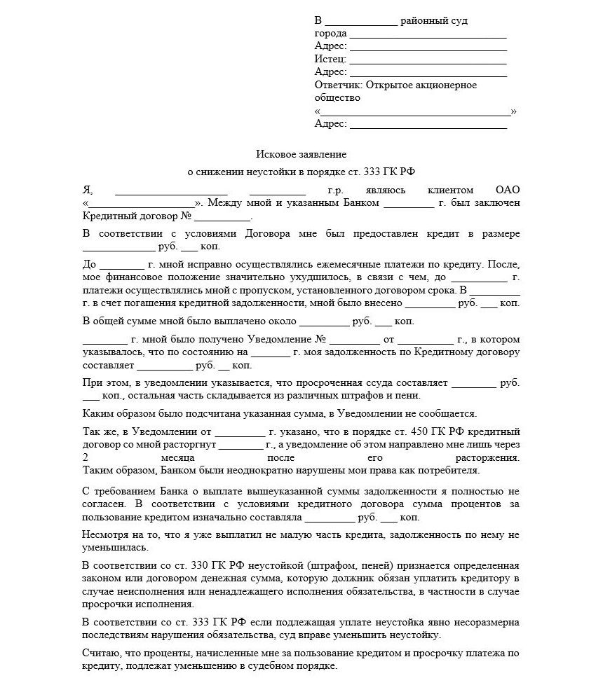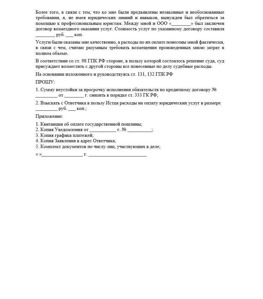Руководствуясь положениями ст. 333 ГК РФ, заемщик вправе просить суд о снижении размера неустойки. Для этого необходимо подать иск. Структура документа определяется ст. 131 ГПК РФ. Основные его составляющие: