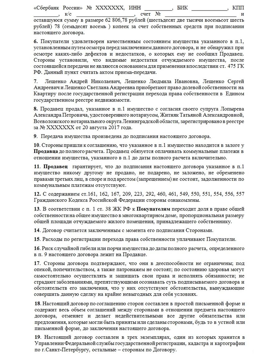 - Персональные данные сторон сделки (их ФИО, адреса регистрации и проживания, года и места рождений, паспортная информация). Важно проследить, чтобы каждый член семьи указывался в качестве «Продавца» наряду с самим Владельцем именного сертификата (речь идет про супруга, совершеннолетних и несовершеннолетних детей).