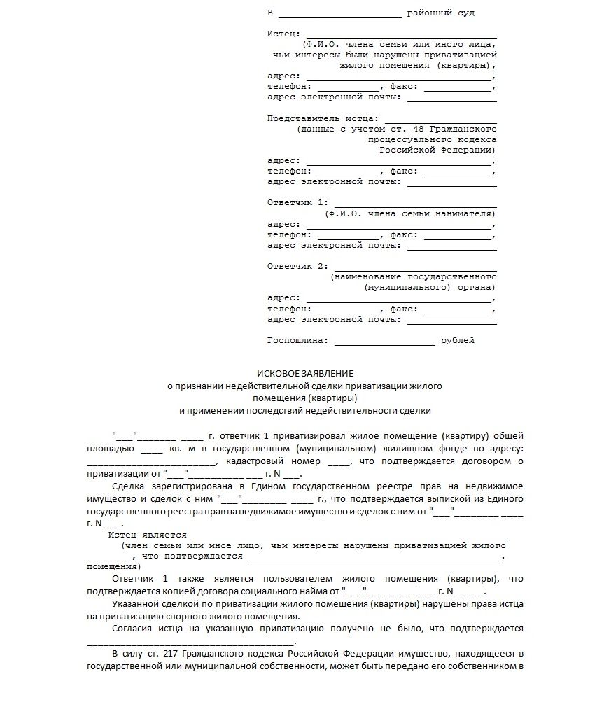 Срок исковой давности для подобных дел – 3 года с момента проведения незаконной приватизации. Собственнику, желающему вернуть свою долю и всю квартиру в ведение муниципалитета, понадобится подать в районный суд по месту жительства стандартно составленное исковое заявление. Здесь указываются следующие сведения: