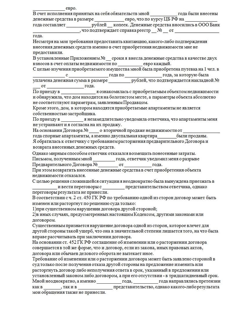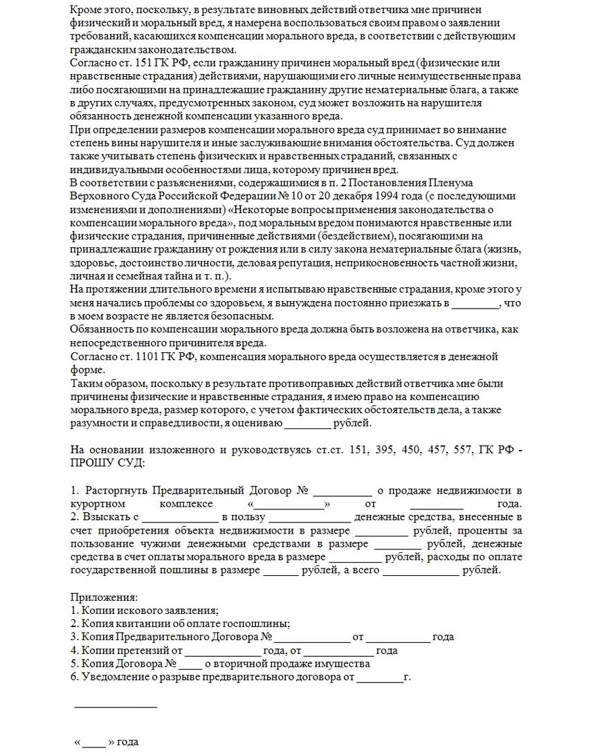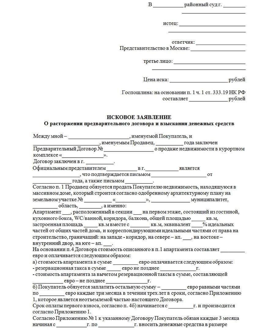 Обычно судопроизводство возбуждается в связи с подачей искового заявления «О расторжении предварительного договора и взыскании денежных средств». Исход конфликта будет зависеть от того, какой участник приведет более убедительные аргументы и доказательства в защиту своей позиции. Предварительный договор может быть или расторгнут, или использован судом в качестве базы для принудительного заключения основного договора. Проигравшая сторона также должна будет покрыть все расходы своего оппонента, а возможно – и выплатить ему денежную компенсацию за моральный ущерб.