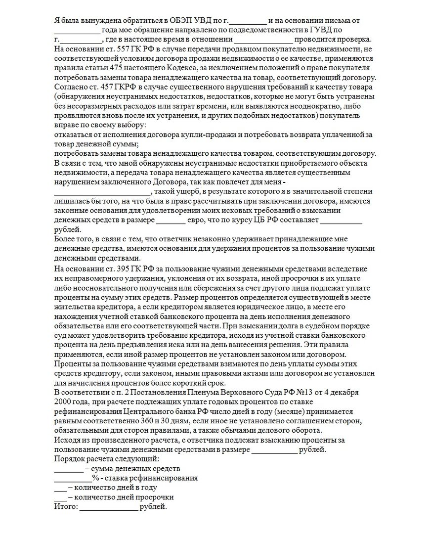 При невозможности мирно урегулировать ситуацию Покупатель (если деньги должны быть возвращены ему) может инициировать судопроизводство, составив исковое заявление «О взыскании задатка в двойном размере» или «Об истребовании суммы аванса». Чтобы не вести несколько параллельных судебных процессов, эти иски можно объединить с главным иском – «О расторжении предварительного договора и взыскании денежных средств».