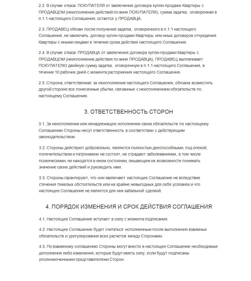 - прядок разрешения ситуации в случае срыва сделки и/или неисполнения положений основного договора (кому, как и в каком размере будет возвращен задаток);