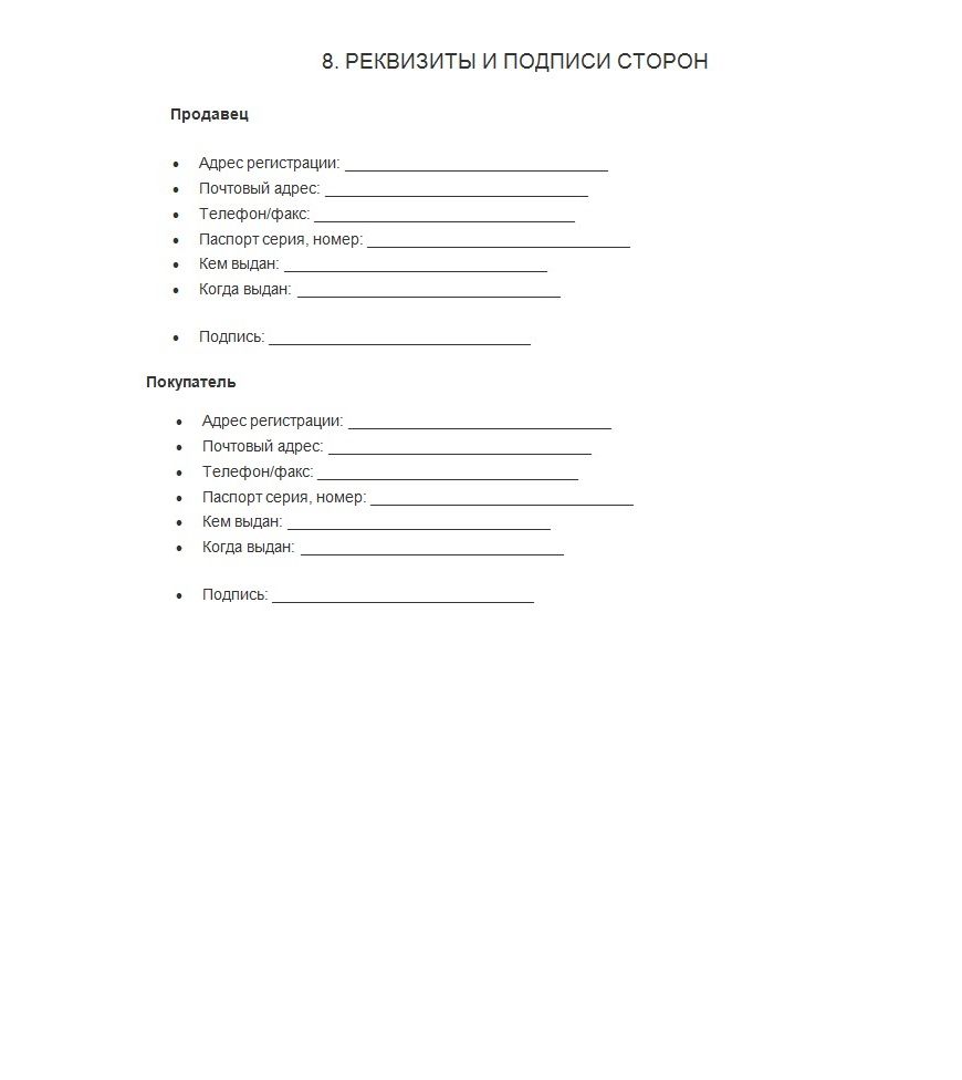 - ФИО, год рождения, место рождения, адрес регистрации, адрес фактического проживания и паспортные данные Продавца;