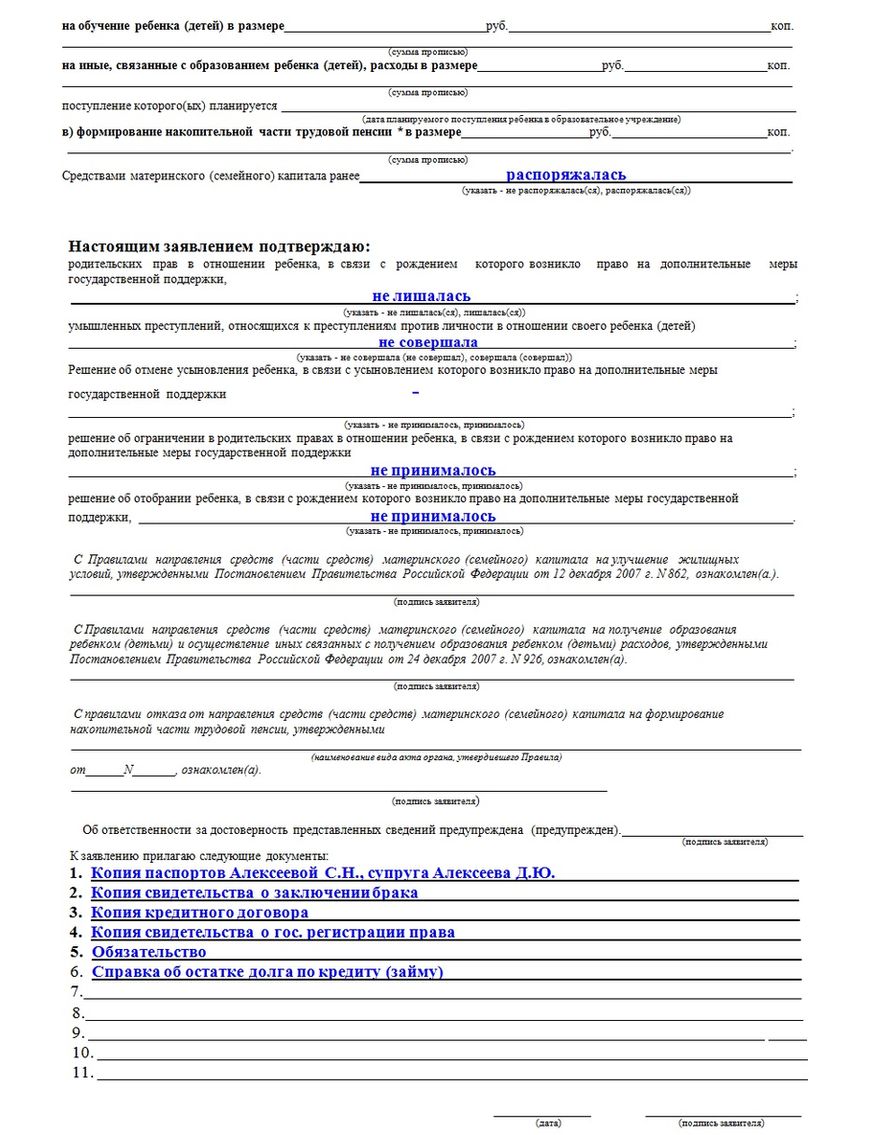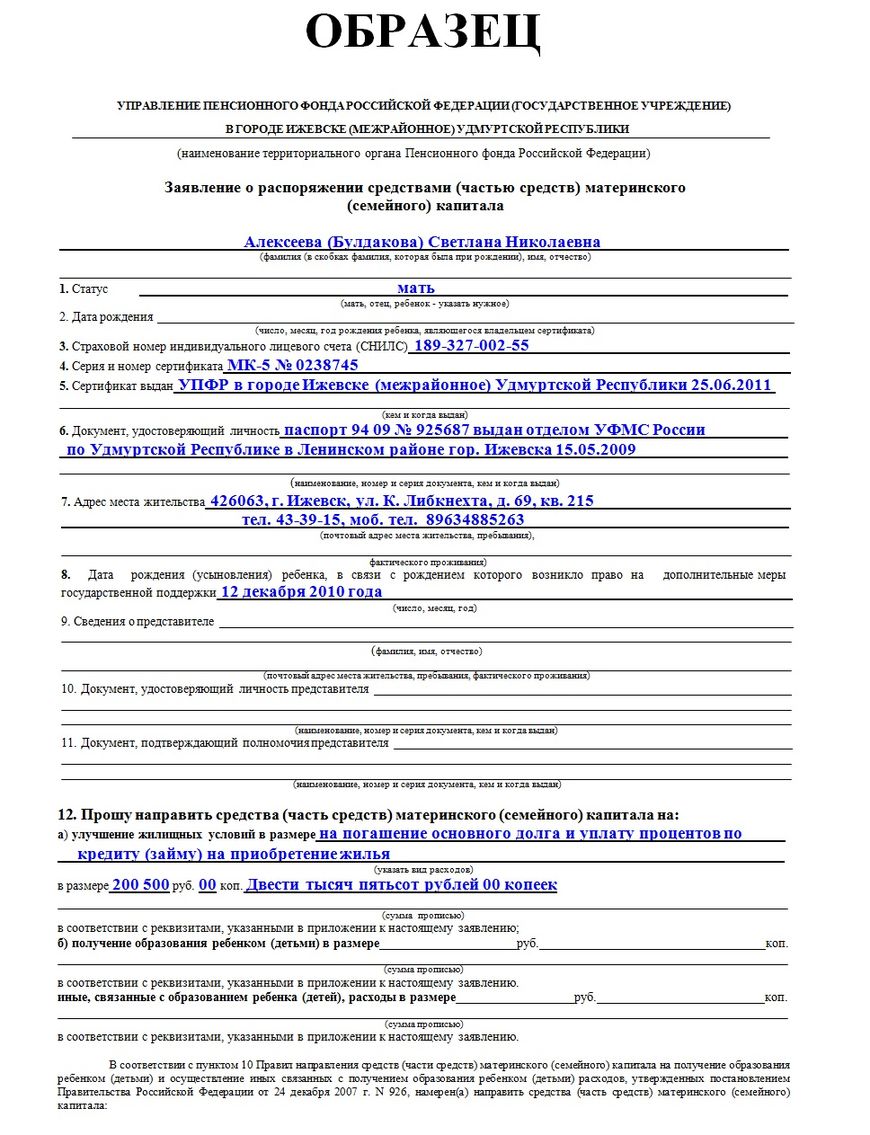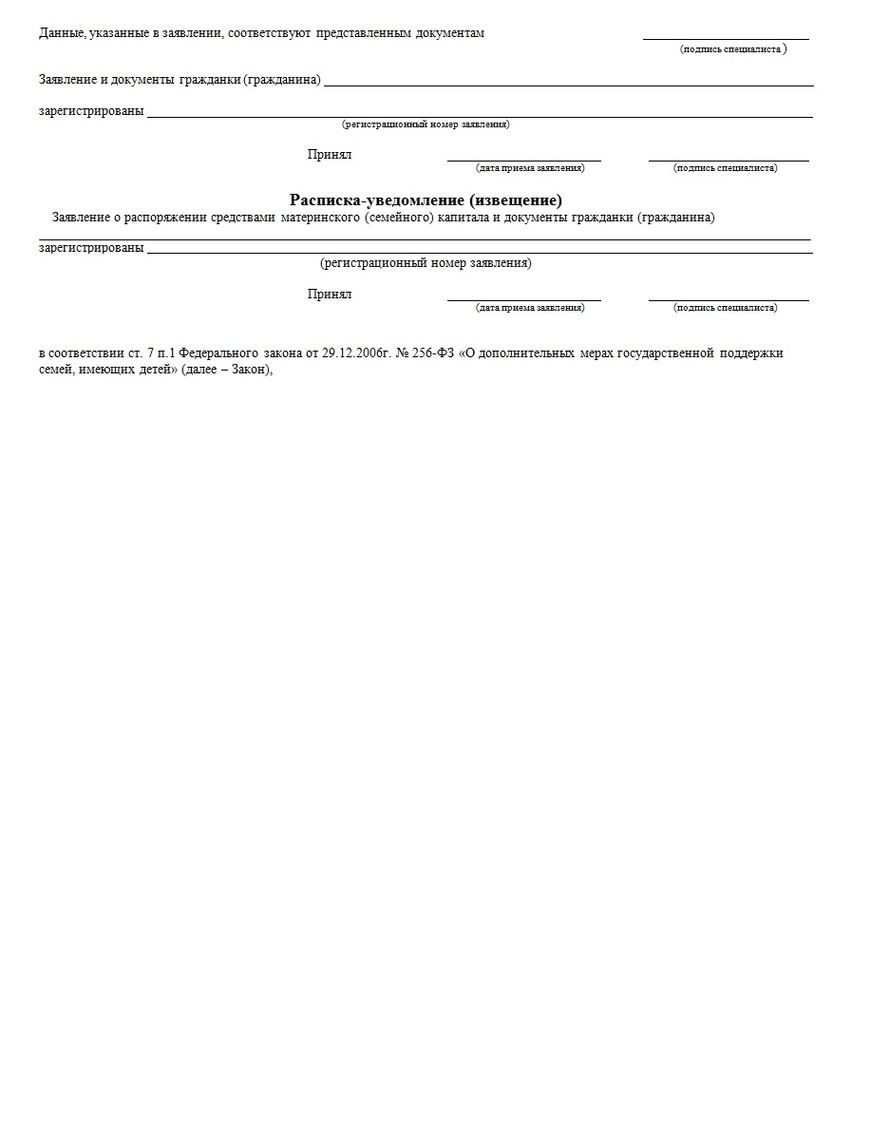 Заявление о распоряжении средствами материнского капитала имеет установленный государственный образец. Так, здесь должны быть отражены следующие сведения:
